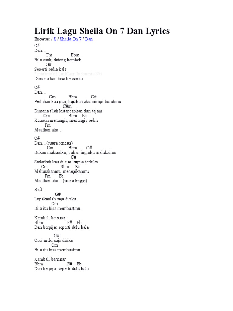 . Lirik Dan Sheila On 7. Dan Dan Bila esok datang kembali Seperti sedia kala Di mana kau bisa bercanda Dan Perlahan kau pun Lupakan aku mimpi buruk mu Dimana telah ku tancapkan duri tajam Kau pun menangis menangis sedih Maafkan aku 1 Dan Bukan maksud ku Bukan ingin ku melukaimu Sedarkah kau di siniku pun terluka Melupakanmu menepikanmu Maafkan aku 2 Lupakanlah saja diriku Bila. Berikut cuplikan syair nyanyian teks dari lagunya.